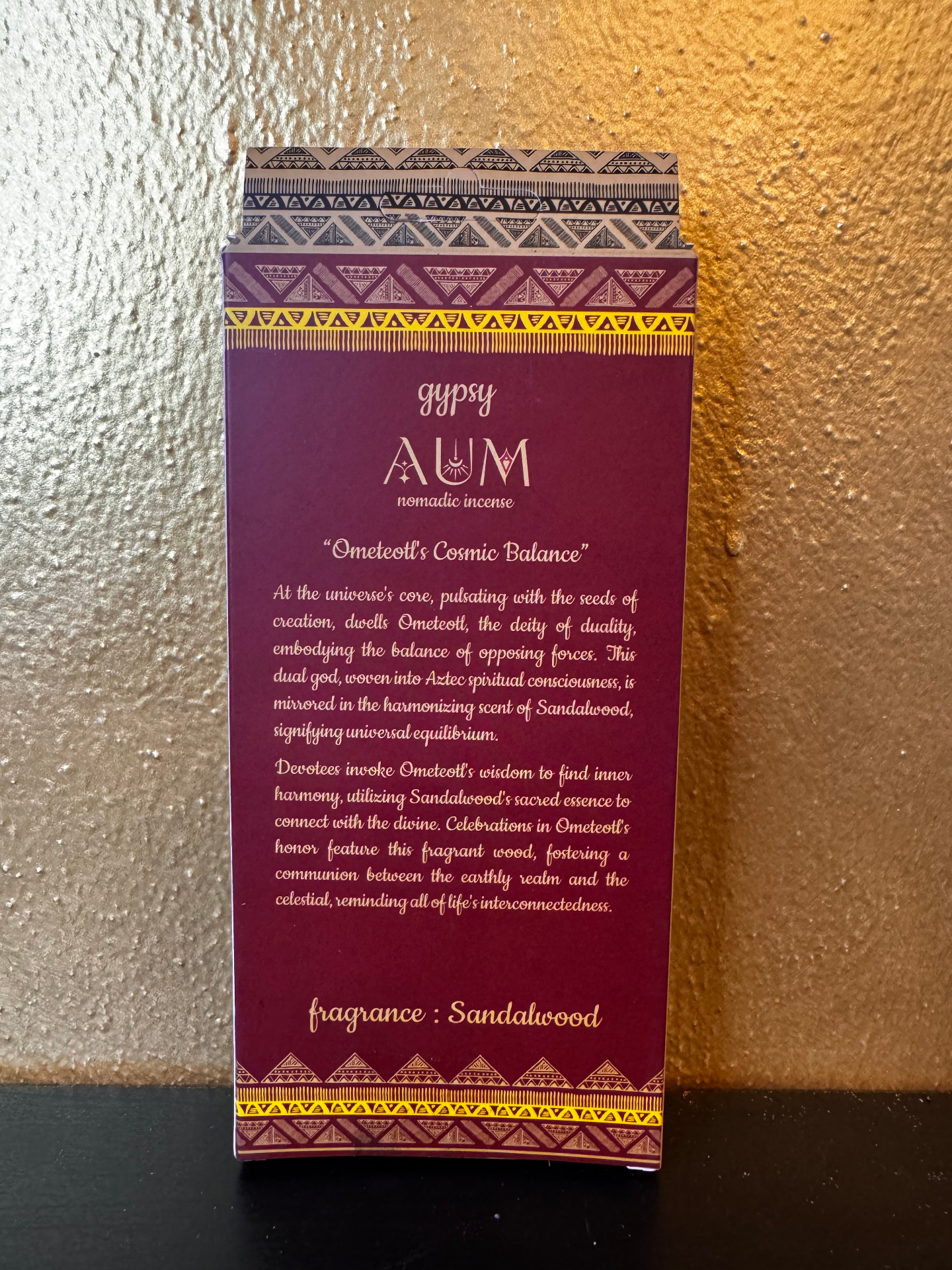 Nel cuore dell'universo, pulsante dei semi della creazione, dimora Ometeotl, la divinità della dualità, che incarna l'equilibrio delle forze opposte. Questo dio duale, intessuto nella coscienza spirituale azteca, si rispecchia nel profumo armonizzante del legno di sandalo, che simboleggia l'equilibrio universale.