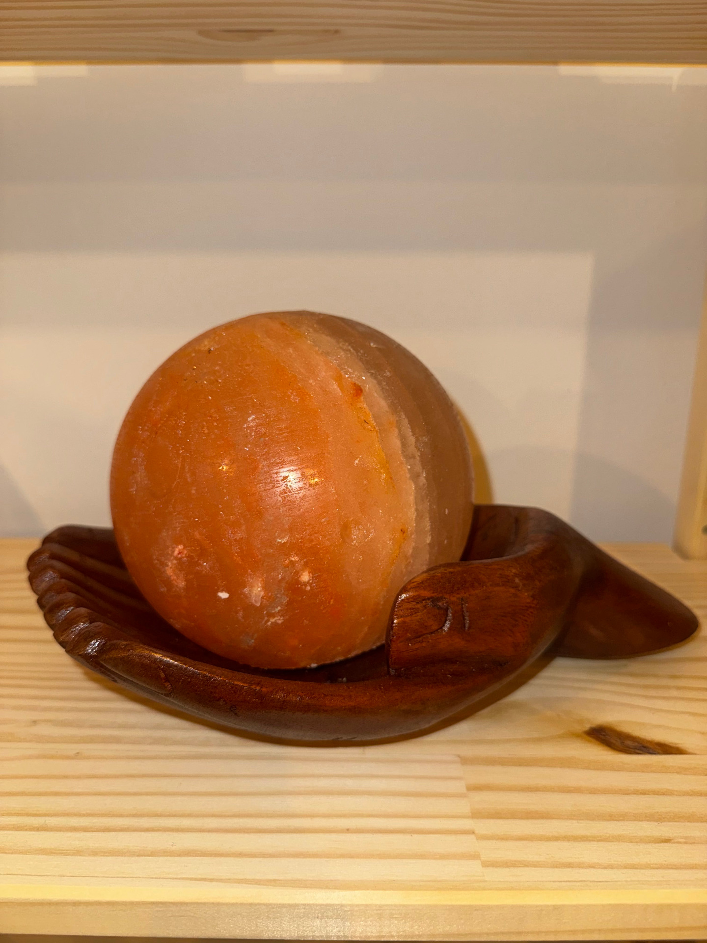 Lampada in salgemma hymalaiana naturale a sfera lavorata a mano con base in legno a forma di mani
