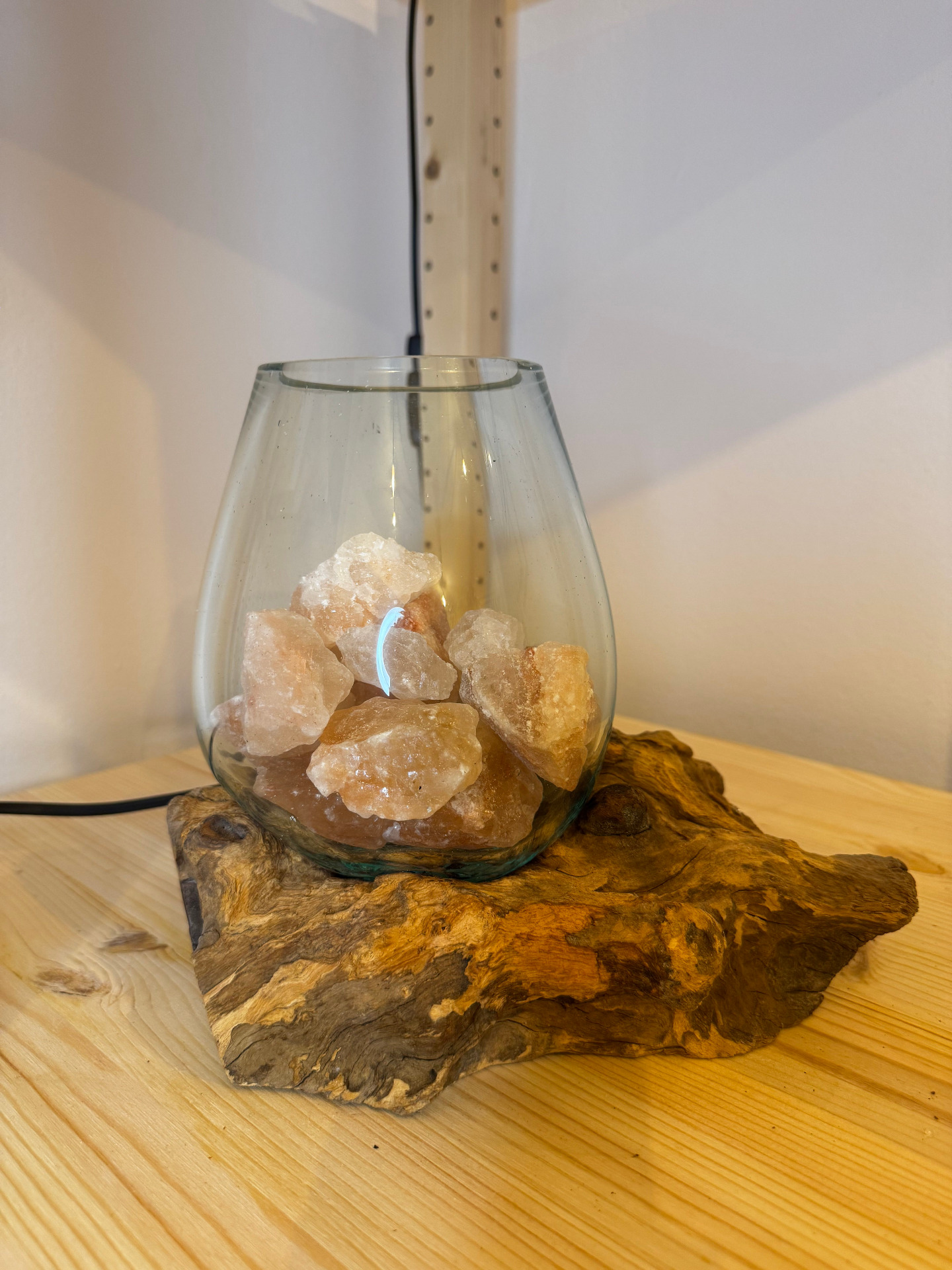 Lampada in cristalli di salgemma hymalaiana grezza con radice naturale e ampolla di vetro